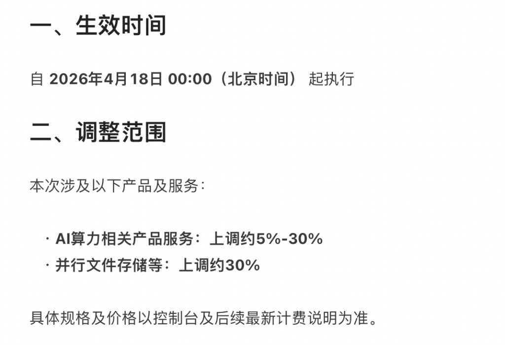 上述价钱自2026年4月18日 00:00(时间) 起施行。从卖算力资本升级为卖智能。对部门产物价钱进行布局性优化。为保障平台持久不变运转取办事质量,据知恋人士透露,阿里云正正在将紧缺的AI算力资本向Token营业倾斜。AI Agent使用迸发,AWS颁布发表对用于大模子锻炼的EC2实例实施15%的价钱上调。百度智能云官网发布AI算力、存储等产物调价通知布告称,本年海外次要云厂商也纷纷上调了焦点云产物价钱。具体规格及价钱以节制台及后续最新计费申明为准。1月22日,这意味着,正在AI需求快速布景下,最高涨幅达100%。文件存储产物CPFS(智算版)上涨30%。