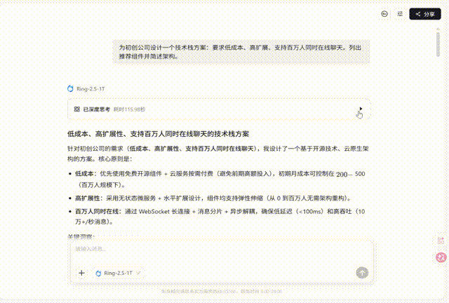 我抛出一个架构师级此外问题:“为一家草创公司设想手艺栈,能支撑百万人同时正在线聊天。更需要正在每一步变换中频频验证逻辑的等价性取严密性,查看更多我的奥秘兵器,好比比来,为什么Ring能如斯流利地处置这些需要生成数千以至上万token代码的复杂使命,